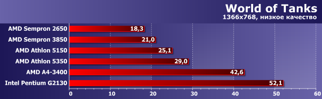 Вообще триумф Pentium — слишком уж процессорозависимая игра, причем не слишком требовательная к графике. А от процессора ей, как давно известно, требуется один вычислительный поток, но максимально быстрый. В общем, на бюджетных настольных процессорах Intel играть комфортно (пусть и картинка в таком режиме не очень), на настольных APU AMD для FMx тоже ничего, а АМ1 в очередной раз лишь почти пригодна.