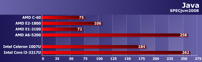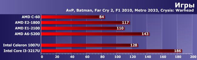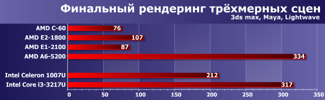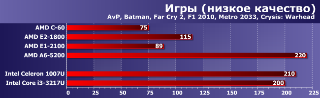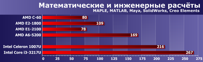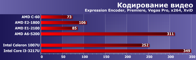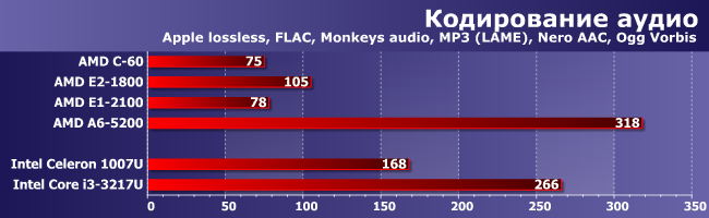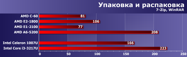 Но когда наоборот (если код разный, а ПСП важна), тогда все возвращается на круги своя: догнать Core i3 (даже самый слабый и уже устаревший) не выходит. С другой стороны, это все равно огромный рывок — лучшее, что предлагала AMD в этом сегменте ранее и с Celeron-то конкурировать уже не могло. Причем не обязательно с современным — старшие модели Brazos с трудом «доползли» лишь до уровня Celeron SU2300 четырехлетней давности. Ну а современные модели Celeron, естественно, в полтора и более раз быстрее со всеми вытекающими, однако до А6-5200 им остается еще полтора. Е1-2100, напротив, в очередной раз нас разочаровал — при такой нагрузке он должен быть быстрее С-60. Тем более что у него не только процессорные ядра быстрее, но и кэш-память, да и частота оперативной выше. Возможно, конечно, есть какие-то особенности у конкретного продукта (а такое бывает — мы уже видели, как можно затормозить С-70), но пока никаких эталонов для сравнения у нас нет. Да и других продуктов на этом APU вообще на рынке поискать еще :) Поэтому просто констатируем факт, что младшая модель в линейке вовсе не обязательно будет выигрывать у Ontario в производительности, к чему нужно быть готовым каждому покупателю. C другой стороны, те, кому и правда важна производительность, как нам кажется, на этот сегмент внимания и не обращают.