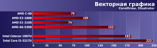 Что касается этих программ, то положение двоякое: все-таки новые Celeron быстрее, но по сравнению с Zacate — огромный шаг вперед. Причем, заметим, почти на пустом месте — двух ядер более чем достаточно. Т.е. «выстрелили» другие преимущества новой архитектуры — в первую очередь быстрый и единый L2, что роднит Kabini с Core 2, а именно под это программы векторной графики до сих пор и оптимизированы в первую очередь. И именно поэтому Е2-1800 тут медленнее, чем даже Celeron SU2000/U3000 многолетней давности, а вот A6-5200 уже быстрее, нежели многие CULV-процессоры линейки Sandy Bridge. Но, конечно, не Ivy Bridge, где к усовершенствованиям архитектуры добавились и более высокие тактовые частоты.