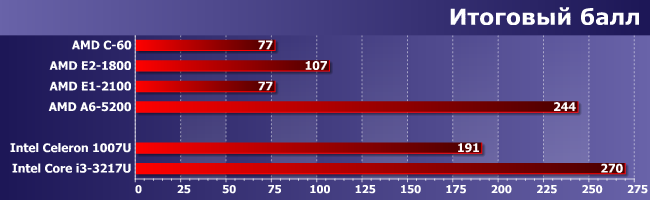 Почти первое место. Можно даже сказать, что оно тут первое одно на двоих. В общем, решение AMD дистанцировать А6-5200 и А4-5000 (на данный момент единственные четырехъядерные Kabini) от разнообразных E1/E2 является правильным — это продукты разного уровня. Причем сравнение результатов E1-2100 и C-60 показывает, что слишком многого только лишь от новой процессорной архитектуры ждать не стоит, так что, опять же, сохранение для двухъядерных Kabini принадлежности к указанным линейкам тоже верно.
