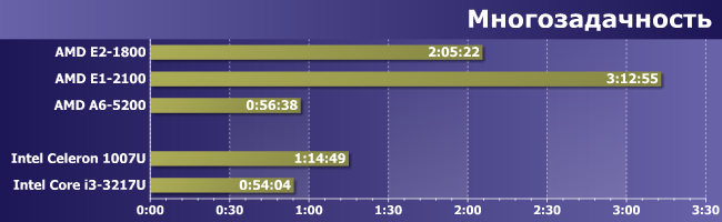 Увы, но даже четыре высокочастотных ядра не позволили A6-5200 выйти на первое место — любой «ивиковый» Core i3 быстрее. С другой стороны, «сэндик» на 1,6 ГГц работал медленнее, а уж про трехкратное (!) преимущество над Brazos и говорить нечего. С практической точки зрения можно констатировать качественную, а не количественную разницу — старая платформа AMD не позволяла даже задумываться о таких задачах, а вот на новой их можно решать. Не слишком быстро, но можно. Было время, и «взрослые» ноутбуки работали куда медленнее. И не такие уж доисторические — любой ноутбучный Core 2 Duo подойдет, а ведь устройства на них до сих пор встречаются в продаже.