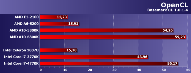 Мы решили поэкспериментировать и с такой нагрузкой, благо AMD делает настолько явный упор на гетерогенные вычисления, что даже придумала для своих процессоров специальное название :) Intel ничем таким не занималась, однако медленно, но верно довела функциональность собственных IGP до того же уровня — начиная с Ivy Bridge, OpenCL-код выполняется и на графических ядрах. Правда вот у нас возникла некоторая заминка с участниками — большую часть основных сегодняшних героев мы при помощи Basemark CL не тестировали. Ну что ж — приведем результаты тех, кого тестировали, а для пущего эффекта добавим на диаграмму и то, чего достигают «взрослые» модели как AMD, так и Intel.