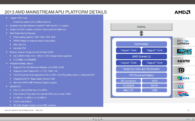 Стоит, правда, отметить, что ничего не дается даром — несмотря на компактность самих ядер Jaguar и использование техпроцесса 28 нм, результирующий размер кристалла Kabini оказался равным 107 мм², в то время, как Brazos вмещался в 75 мм². Однако вспоминаем о том, что это уже SoC, т.е. в отличие от конкурирующих разработок или более ранних продуктов самой компании для создания законченной платформы требуется ровно один чип. Периферийные же ее возможности выглядят намного более сбалансированными, чем то, что предлагалось в рамках Brazos. Кое-что ненужное отброшено: в отличие от чипсета А50М, Kabini не содержит сетевой контроллер (которым практически никто из производителей не пользовался — всего-то 100 Мбит/с при наличии на рынке копеечных гигабитных микросхем с PCIe-интерфейсом), снабжен лишь двумя, а не шестью портами SATA600 (без комментариев) и портов USB 2.0 осталось восемь, а не 14, а пара USB 1.1 которую AMD с достойным лучшего применения упорством «пихала» во многие чипсеты, канула в лету. Зато большинство модификаций APU получили пару портов USB 3.0, что в наше время излишеством не является. Кроме того, четыре линии PCIe для подключения дополнительных контроллеров модернизированы до версии 2.0, что может тоже пригодиться. Заодно и видеовыходы модернизировали: их по-прежнему три, но пара цифровых теперь поддерживает разрешение до 4К, да и для реализации eDP/LVDS дополнительные трансмиттеры уже не нужны. В общем, несмотря на площадь кристалла где-то между 116 мм² (Ivy Bridge DС GT2, т.е. Core i3 и выше) и 94 мм² (Celeron/Pentium на основе IBDC-GT1) запас «ценовой прочности» у Kabini при нормальном выходе годных кристаллов крайне высок — процессорам Intel требуется чипсет. А переход на Haswell добавляет не только производительности, но и площади основного кристалла при сохранившемся дополнительном для реализации периферийной составляющей, так что положение дел не изменится: в принципе старшие модели младшего семейства APU оставляют AMD некоторую свободу ценового маневра даже несмотря на отставание по техпроцессу.