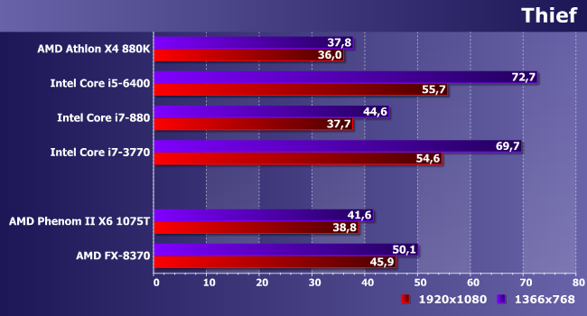 Вот Thief явно «голосует» за мощные платформы — и считает таковыми лишь современный ассортимент Intel. C одной стороны. С другой — нельзя сказать, что что-то совсем уж не работает. Порядка 40 кадров есть — при желании сэкономить на смене платформы, это можно считать достаточным.