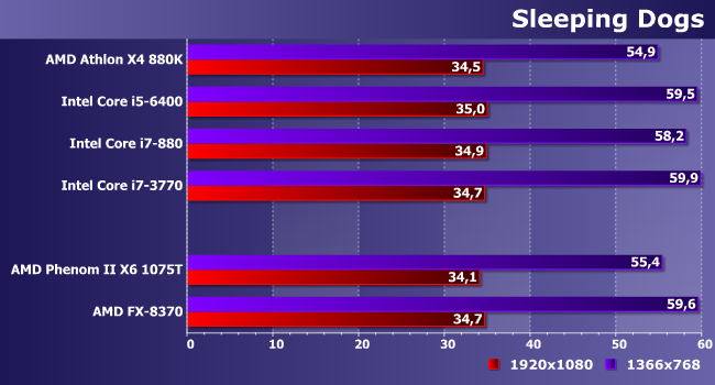 Случай, когда критична «однопоточная производительность», что ставит все процессоры AMD в неудобное положение. Производительность даже (уже) недорогого R9 380 «сдерживают» все испытуемые. Но и играть с комфортом можно на всех же.