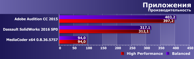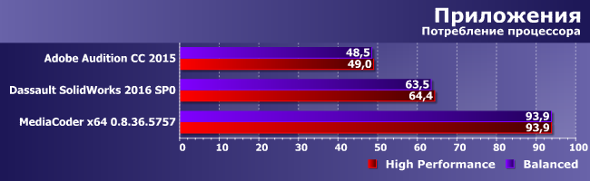Итак, в MediaCoder производительность оказалась вообще одинаковой. И немудрено: транскодирование видео, отлично загружающее работой все 12 потоков, является практически пиковой нагрузкой. А вот две другие программы, в которых есть не только вычисления, и не только активные, при использовании плана «Высокая производительность» отработали чуть быстрее. Эффект, впрочем, невелик — менее 2%, — но он есть и устойчиво обнаруживается.