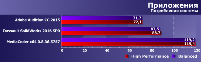 Впрочем, это же верно и для энергопотребления процессора: MediaCoder в любом случае «выжирает» примерно столько, сколько можно предположить, исходя из теплового пакета (т. е. в режиме полной нагрузки какой-никакой смысл он имеет и может использоваться для грубой оценки). В двух других приложениях потребляемая процессором электрическая мощность намного ниже и неплохо коррелирует с изменением производительности, но влияние плана на результат опять же незначительно.