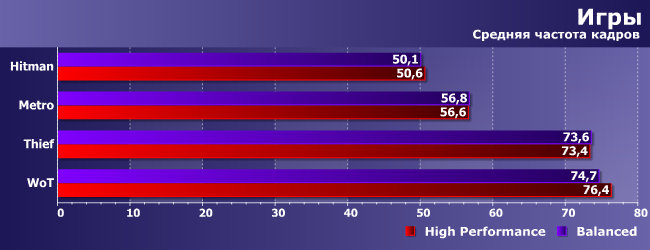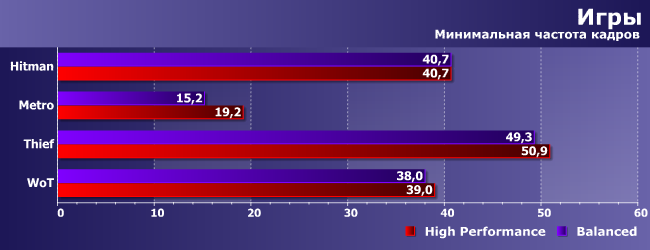 Средняя частота кадров в играх почти не меняется — наибольший выигрыш демонстрирует однопоточный WoT, а в Metro и Thief, если докапываться до каждой цифры, план «Высокая производительность» и вовсе вреден. Понятно, впрочем, что скорость в режиме максимальных настроек в первую очередь определяется видеокартой. И поскольку мы использовали Radeon R9 380, то для получения нормальных результатов даже в этих не слишком новых играх пришлось снизить разрешение с FHD до HD. В тестах по новой методике будет применяться более быстрый видеоадаптер и более требовательные игры, но и из полученных результатов понятно, что никакой практически заметной разницы нет.