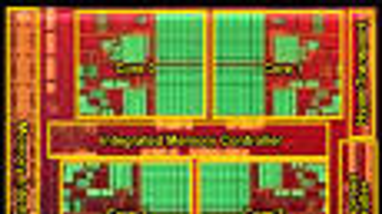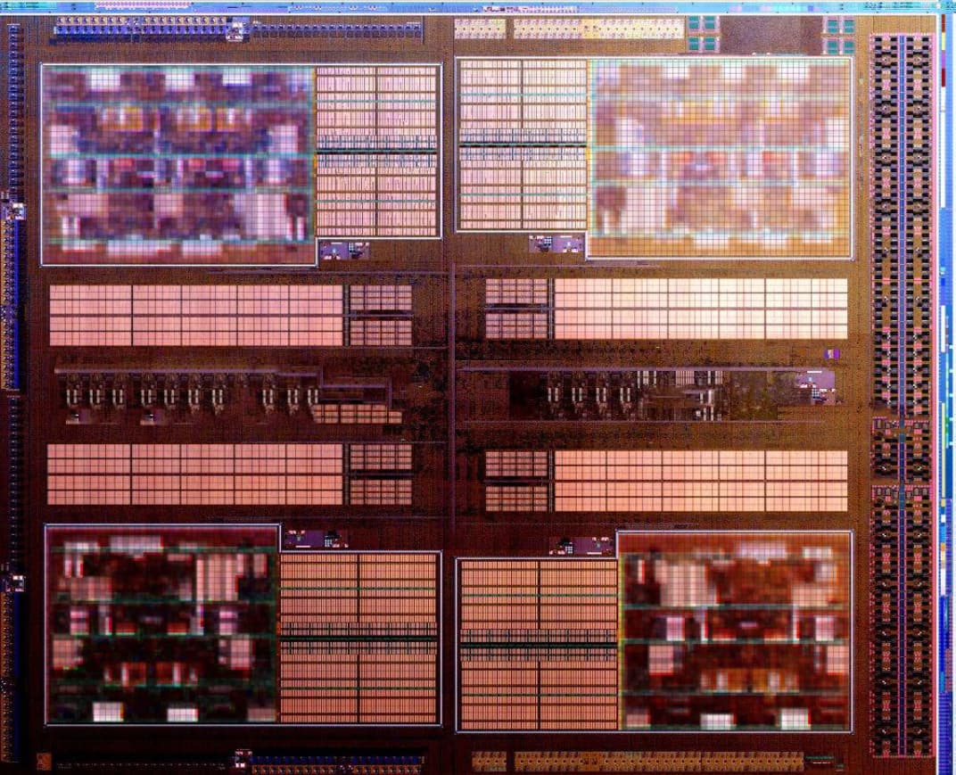 Bulldozer сначала выйдет на 32-нанометровом техпроцессе (и для нового разъёма AM3+, совместимого и с нынешними ЦП), но новая архитектура сделана на годы и поколения вперед (если только её не ждёт участь Pentium 4). Выше показан примерный внешний вид чипа «первенца» — 4-модульного (8-ядерного) ЦП Orochi. Но не стоит детально всматриваться в поисках микроархитектурных секретов — хитрые ребята из AMD без стеснения заявили, что специально исказили снимок, чтобы потенциальный противник (и любопытный журналист) не узнал лишнего раньше времени. Ну, насчёт журналистов это мы ещё посмотрим! ;)