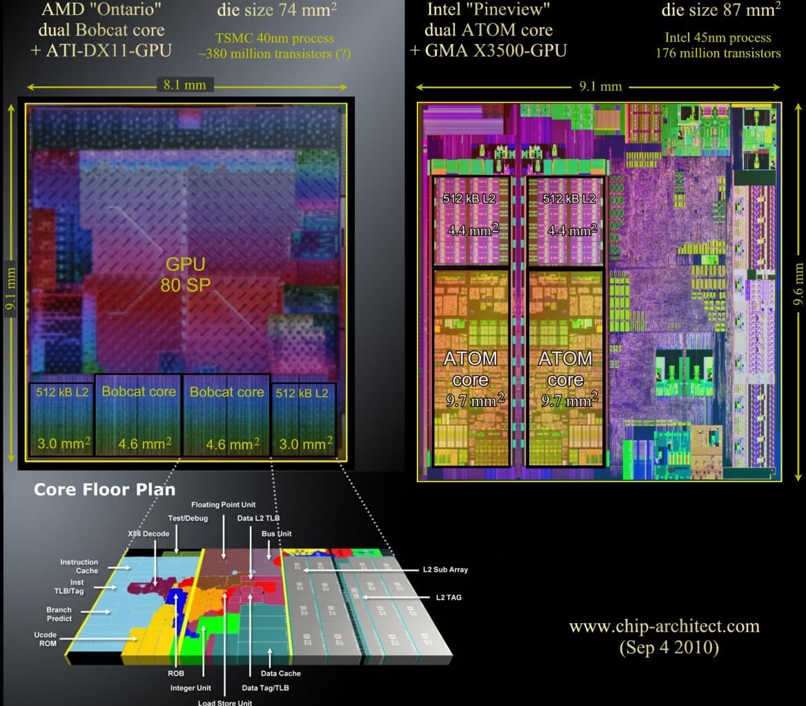 Это ядро разработано с нуля специально для мобильных устройств, где экономия энергии намного важнее скорости. Дорогим оно тоже не будет, т. к. AMD сэкономила и на размере чипа. Иными словами, цели, а значит и рыночные ниши те же, что и у Intel Atom (кроме смартфонов, где ARM будет биться до последнего — и AMD c ней связываться явно не собирается). Но в чём AMD хочет быть лучше?