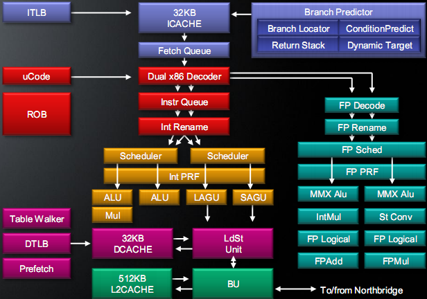 Предсказатель переходов генерирует предполагаемые последовательности исполнения кода двумя потоками. Если этого кода ещё нет в кэше L1I, он заранее подгружается из L2. До 4 декодированных мопов/такт распределяются в 3 исполнительных кластера — два общего назначения и один FPU. В каждом кластере есть общие для всех ФУ планировщики (как у Intel), PRF (вместо ROB) и 4 порта запуска мопов.