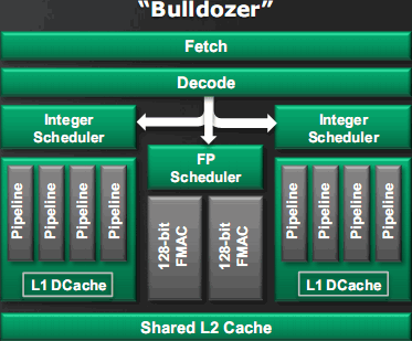 Поскольку Бульдозеру надо не просто победить K10 и современные Core i, но и хотя бы догнать Sandy Bridge — практически все численные показатели улучшены (в сравнении с K10), включая многочисленные буферы и очереди. Но главное — Bulldozer является первой архитектурой AMD с 4-поточным декодированием команд и макрослиянием (вдогонку Intel).