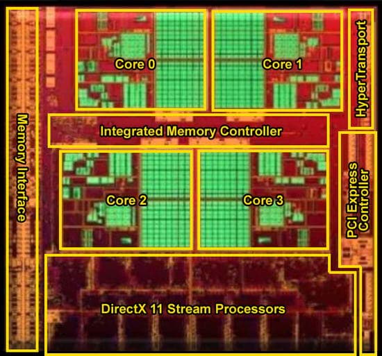 Если не удается ускоряться частотой, приходится делать это увеличением числа ядер, что приводит к росту площади ЦП и его цены. Intel решила проблему технологией гиперпоточности (HyperThreading) — два виртуальных ядра лучше загружают неиспользуемые ресурсы одного физического ядра, но обычно эффект скромен. AMD же вместо этого попарно объединила ядра в модули. Общими и распределяемыми сделаны те ресурсы модуля, производительность которых почти всегда достаточна для обслуживания двух потоков: кэш L2, весь фронт и FPU. А самые нагруженные работой целочисленные блоки и кэши L1D — раздельны (собственно, именно они теперь и называются ядрами). AMD заявляет, что производительность двух потоков на 80% больше, чем у одного, хотя площадь выделенных одному «ядру» блоков — всего 12% площади модуля. Т. е. максимизируется скорость и на ватт, и на квадратный миллиметр. А при запуске лишь одного потока на модуль ему будут доступны все разделяемые ресурсы: второе «ядро» отключается, и свободные ватты позволят занятым транзисторам разогнаться сильнее, так что и 1-поточная производительность не подкачает.