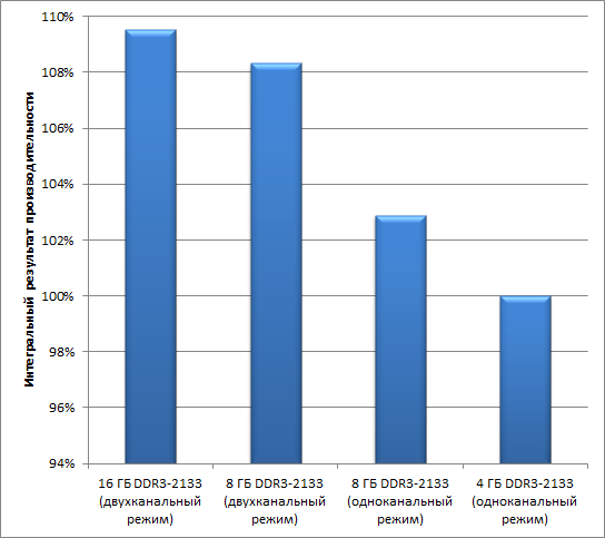 Сопоставляя результаты тестирования для конфигураций с 16 и 8 ГБ памяти DDR3-2133 в двухканальном режиме работы, можно сделать вывод, что если в системе установлено 8 ГБ памяти и более, то от объема памяти результаты нашего бенчмарка практически не зависят. Сравнение результатов для одноканального и двухканального режимов работы при 8 ГБ памяти более показательно: здесь уже разница составляет более 5%. Сравнение результатов тестирования конфигураций с 8 и 4 ГБ памяти в одноканальном режиме дает разницу почти в 3% — не так много, но разница есть. Наконец, если сравнить конфигурации с 16 ГБ памяти в двухканальном режиме и с 4 ГБ памяти в одноканальном режиме, то разница в интегральной производительности составит уже 9,5%, что немало.