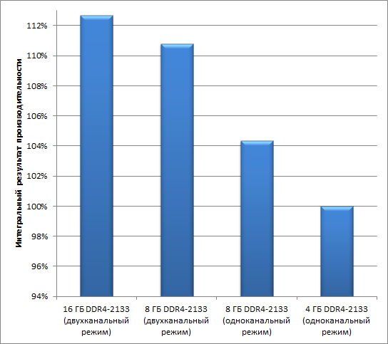 Сравнение результатов для одноканального и двухканального режимов работы при 8 ГБ памяти DDR4 дает разницу в 6,2%. Ну а если сравнить конфигурации с 16 ГБ памяти в двухканальном режиме и с 4 ГБ памяти в одноканальном режиме, то разница в интегральной производительности составит уже 10,8%.