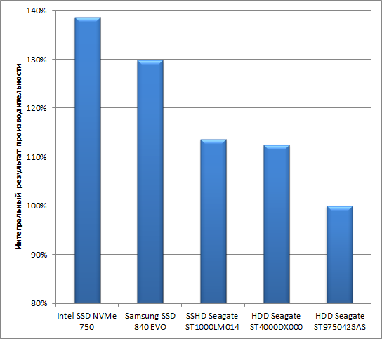 Как видим, результаты тестирования довольно сильно зависят от производительности накопителя. К примеру, если сравнивать интегральный результат производительности системы с медленным HDD Seagate ST9750423AS и результат системы с быстрым Intel SSD 750 Series, то разница составляет почти 40%, что заметно уже невооруженным глазом. И даже «обычный» Samsung SSD 840 Evo обеспечивает на 30% более высокую производительность в сравнении с медленным HDD Seagate Momentus. Производительность накопителя отражается на всех тестах, за исключением SVPmark.