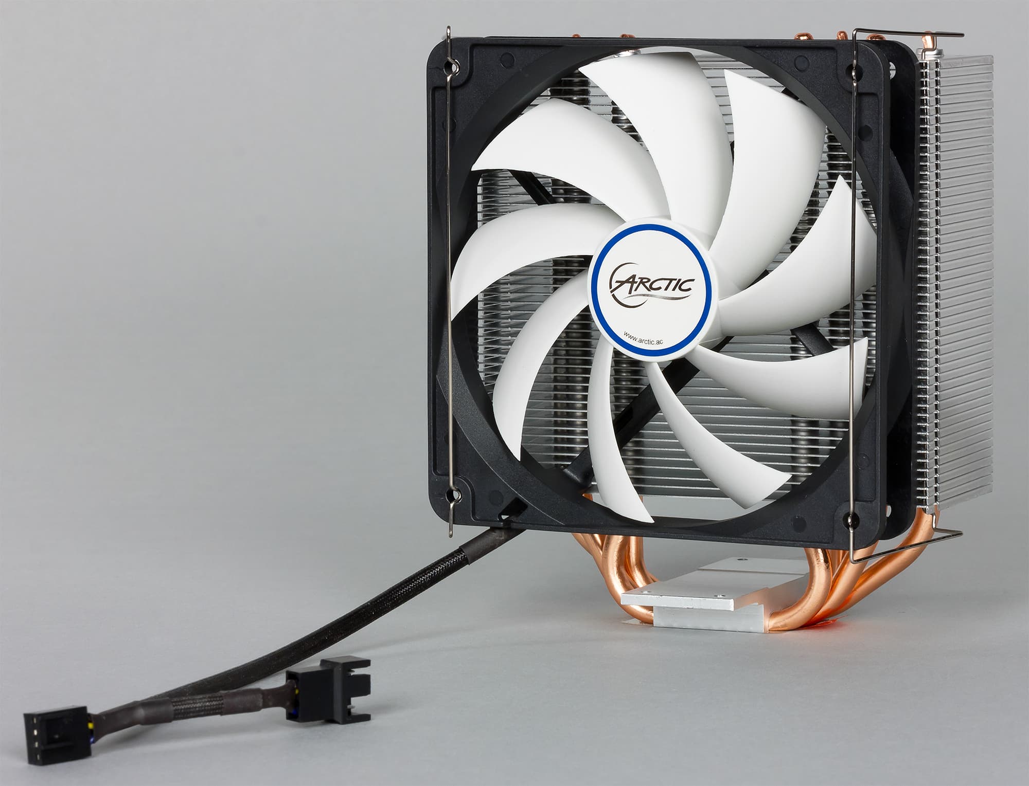 Вентилятор кулера имеет четырехконтактный разъем (общий, питание, датчик вращения и управление ШИМ) на конце кабеля, от которого идет короткий кабель с гнездом с тремя контактами (без выхода датчика вращения) под второй вентилятор. Провода вентилятора заключены в плетеную оболочку. Согласно легенде, оболочка уменьшает аэродинамическое сопротивление, но принимая во внимание толщину плоского четырехпроводного кабеля внутри этой оболочки и ее внешний диаметр, мы в правдивости этой легенды сильно сомневаемся. Впрочем, оболочка позволит сохранить единый стиль оформления внутреннего убранства корпуса.