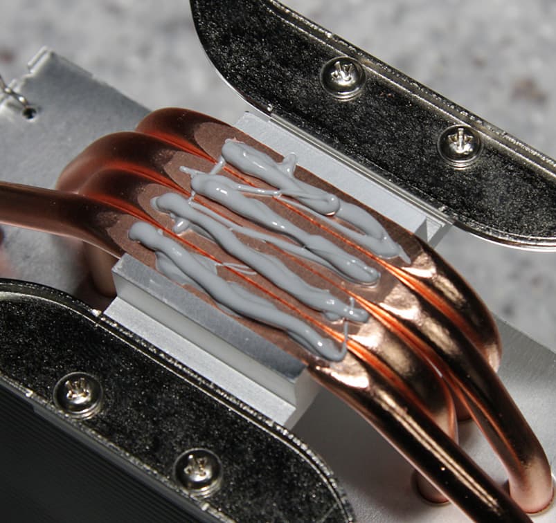 Видно, что термопаста распределилась очень тонким слоем в местах контакта тепловых трубок с центральной частью крышки процессора, а ее избыток выдавился по краям. Очевидно, что в данном случае с термопастой сложно переборщить, так как ее избытки выдавливаются в канавки между термотрубками и за плоскость подошвы. Отметим, что свежая и после тестов данная термопаста относительно жидкая, липкая и чуть тягучая, она выдавливается гораздо легче, чем счищается.