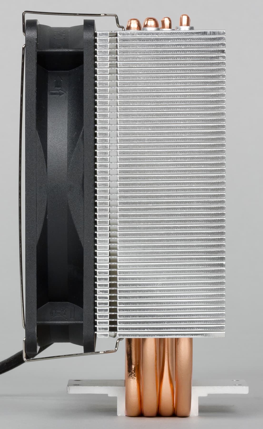 По ширине габариты вентилятора чуть меньше рабочей плоскости радиатора, а по высоте радиатор совсем немного меньше диаметра вентилятора, поэтому лишь пренебрежимо малая часть воздушного потока проходит мимо пластин.