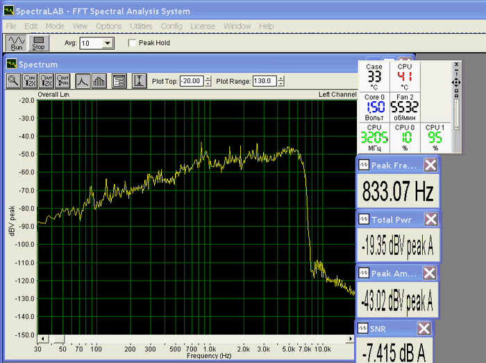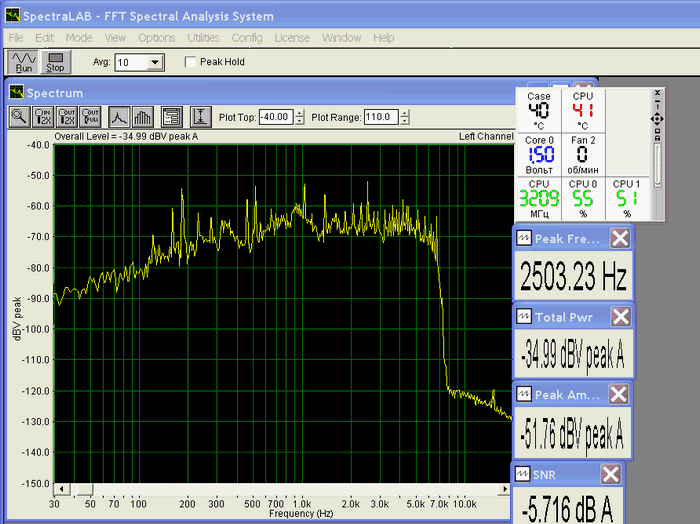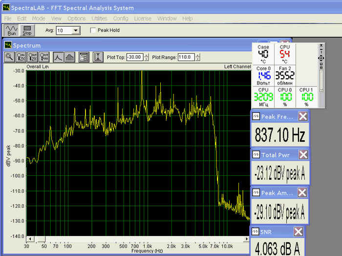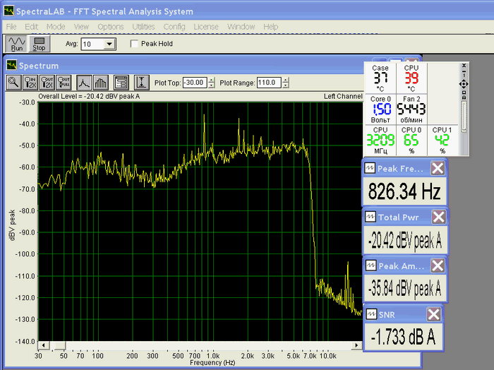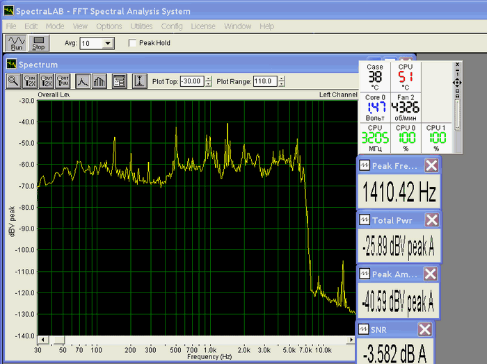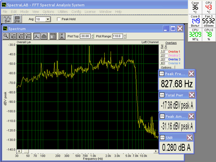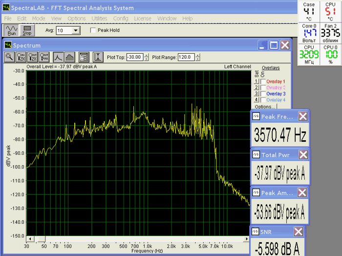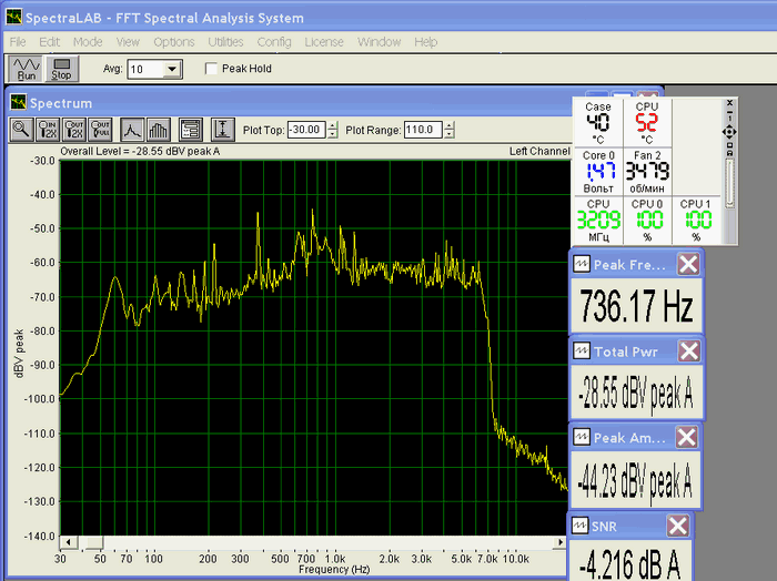 Измерения шума кулеров проводились в соответствии с ранее использованной нами методикой. Измеряемый одним микрофоном относительный уровень звукового давления оцифровывался и обрабатывался в реальном времени в программе SpectraLab (нагрузка процессора SpectraLab’ом во время проведения тестов составляла порядка 50%). Кроме собственно спектров шума, взвешенных по кривой «А» (см. скриншоты ниже), регистрировались относительные значения общей мощности шумового сигнала, которые затем нормировались — для сравнения с паспортными значениями — при помощи единой для всех поправки. Измеренные нами данные по уровню звукового давления кулеров нельзя в точности сравнивать с «честными» паспортными значениями шума кулеров, указываемых в спецификациях (последние отражают уровень звуковой мощности, а не давления, и измеряются набором микрофонов на расстоянии 1 м от источника сигнала в очень тихой комнате; такие стандартизованные измерения весьма дорогостоящи). Однако по нашей многолетней измерительной практике, если использовать аккуратно подобранную нормировочную поправку, то измеренные таким образом значения достаточно хорошо совпадают с паспортными уровнями шума кулеров (например, по линейкам от GlacialTech) и винчестеров разных производителей. Поэтому для экспресс-оценки шумности кулеров наша методика дает вполне уверенные и разумные результаты. Кроме того, по спектрам шума можно оценить, какие гармонические и спектральные компоненты наиболее существенны в шуме той или иной модели.
