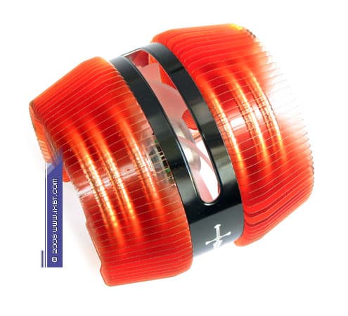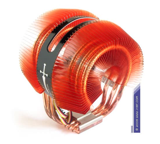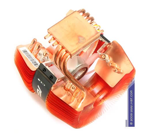 Хорош наш подопытный и в чисто термической детализации — отмечаем две фактически самостоятельных секции оребрения (каждая обслуживается тремя «собственными» тепловыми трубками), облагороженных насыщенным конфигурированием (64 пластины в секции, толщина 0,2 мм, шаг размещения 1 мм на внутреннем радиусе и 4 мм на внешнем радиусе оребрения). Причем, несмотря на довольно компактные габариты радиатора, общая площадь поверхности теплообмена здесь развита до величины порядка 4000 см2, что вполне соответствует хай-эндовым показателям (в этом ракурсе Silent Knight II почти нагоняет Scythe Ninja и перекрывает Zalman CNPS9500).