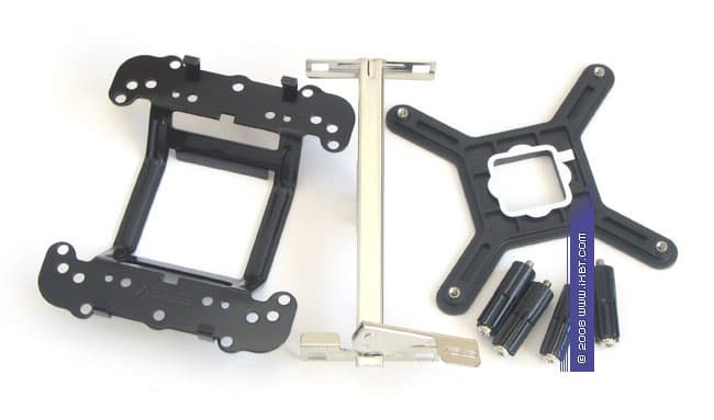 Примерно в том же ключе действует и Silent Knight II — по факту, его крепежный комплект вряд ли можно назвать дружелюбным в инсталляции. Так, чтобы установить кулер на платформе Intel LGA775, потребуется в обязательном порядке демонтировать материнскую плату из корпуса, далее на четырех пластиковых распорках зафиксировать винтами крепежную раму, приложив к обратной стороне сокета комплектную крестовину-супинатор (тоже пластиковую, с весьма скудным эксплуатационным ресурсом в части циклов монтажа/демонтажа), и уже только потом зафиксировать собственно сам кулер посредством специализированной крепежной скобки (которая, опять же, характеризуется неудобным поворотным рычагом и далеко не самым жестким прижимом). Сходную последовательность операций придется провести и на платформе AMD Socket AM2, где дело еще больше усугубляется обязательным демонтажем стандартных крепежных приспособлений и необходимостью прикручивания дополнительной, «вторичной» крепежной рамки в случае ориентации сокета «Юг-Север», для правильного перенаправления воздушных потоков. Как видим, трудоемкая инсталляционная возня с Silent Knight II четко повторяет «классические» капризы хай-эндовых кулеров — вынужденные сложности с адаптацией под нетривиальный конструктив и мультплатформенность вполне закономерно ослабляют функциональную выправку кулера. И, похоже, поле для дальнейшего совершенствования крепежа остается тут еще очень и очень широким!