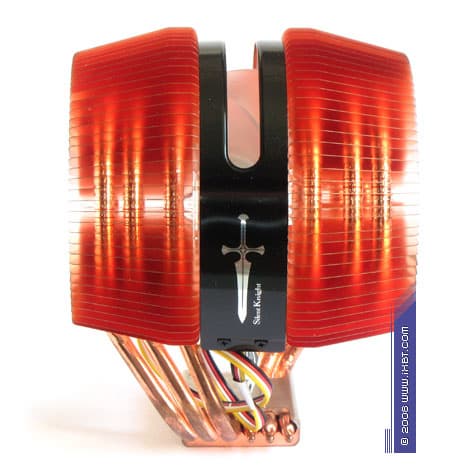 Как и подобает продукту высшего класса, Silent Knight II аккумулирует в своем «подорожном наборе» весьма серьезное рыцарское снаряжение: конструктив кулера образован солидным комплексом в составе медного теплосъемника 40×38×7 мм, 6 медных тепловых трубок диаметра 6 мм и медного оребрения с двухсекционной радиальной структурой (эффективные размеры 115×110 мм), который аккуратно дополняется набортным вентилятором с крыльчаткой типоразмера 92×92×25 мм (номинальная скорость вращения 2400 об/мин, ШИМ-контроль оборотов).