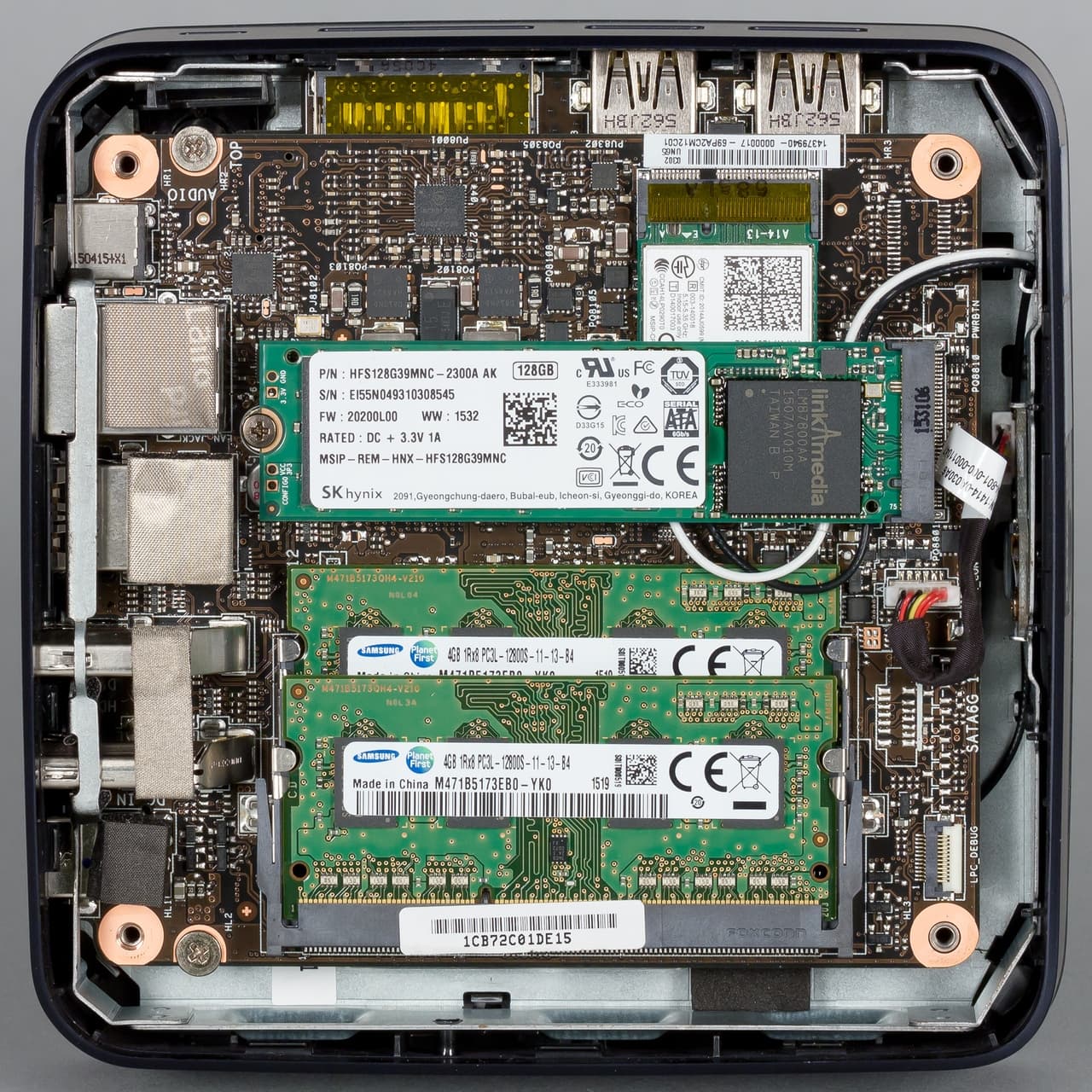 Основой данной компактной системы служит одночиповое решение шестого поколения Intel Core i5-6200U. На сайте производителя также упоминаются варианты комплектации моделями Intel Core i7-6500U и Intel Core i3-6100U. Эти микросхемы включают в себя как собственно процессор, так и хаб ввода-вывода, что позволяет сократить размеры печатной платы, но исключает возможность апгрейда, поскольку упаковка FCBGA1356 рассчитана на пайку, а не установку в разъем. TDP чипов составляет 15 Вт, что заметно меньше массовых моделей для настольных компьютеров, но, тем не менее, не позволяет обойтись без вентилятора.