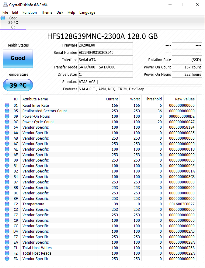 Системный твердотельный накопитель выполнен в формате M.2 2280. Его объем может составлять от 32 до 256 ГБ. В нашем случае был установлен Hynix HFS128G39MNC-2300A объемом 128 ГБ на базе контроллера LAMD LM87800 с интерфейсом SATA. По информации Windows, у системы «из коробки» свободно 85 ГБ из 118 ГБ. Заметим, что производитель компьютера указывает в описании устройства поддержку в слоте M.2 не только SATA, но шины PCIe. Никаких других вариантов для подключения накопителей на внутренние порты в системе не предусмотрено.