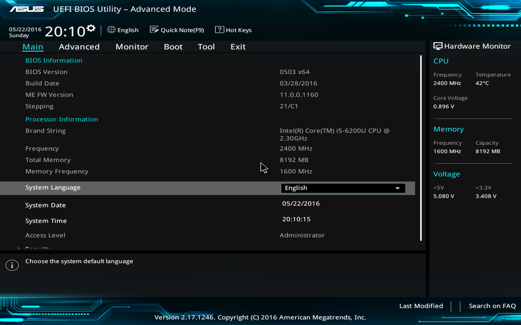 Компьютер имеет знакомый по материнским платам для настольных систем этого производителя BIOS с UEFI, хотя, конечно, использованная модификация предоставляет существенно меньше возможностей.
