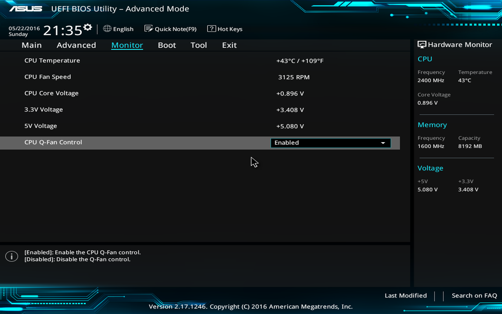 В разделе Monitor представлена информация о температуре процессора, напряжениях и скорости вращения вентилятора. Для последнего можно отключить режим Q-Fan. Правда, делать это мы бы не рекомендовали. На постоянной скорости вращения около 6000 об/мин вентилятор становится отчетливо слышно.