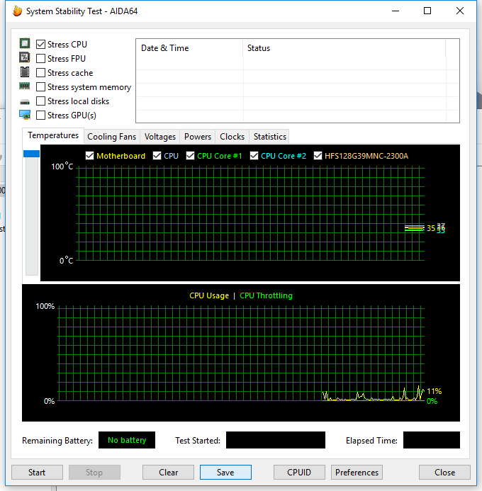 Сначала, как обычно, проверим эффективность работы использованной системы охлаждения. При отсутствии нагрузки процессорные ядра работают на частоте 400 МГц, а их температура немногим превышает 30 градусов. Накопитель в этом режиме имеет температуру 36 градусов. Скорость вращения вентилятора составляет 3000 об/мин. Его не слышно даже в тихой домашней обстановке.