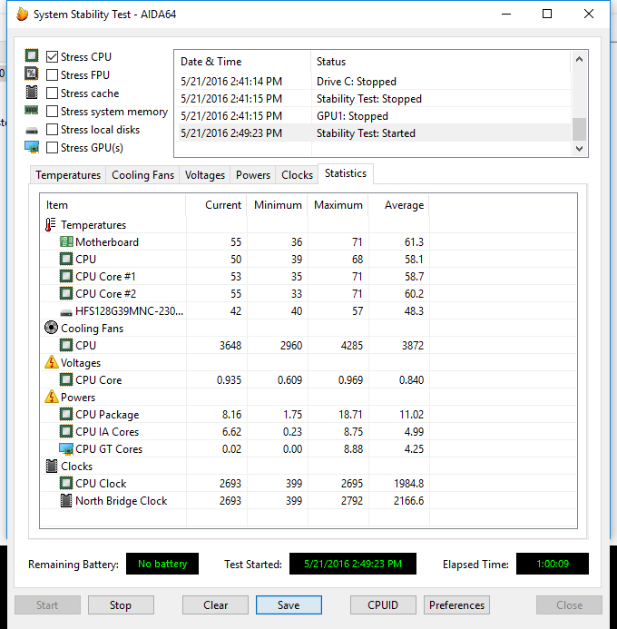 Под нагрузкой на блоки целочисленных вычислений они разгоняются до 2,7 ГГц, что превышает базовую частоту чипа. Температуры ядер и диска повышаются до 55 и 43 градусов соответственно. Вентилятор в этом случае работает на 3700 об/мин. Уровень шума, производимого компьютером, практически не меняется.