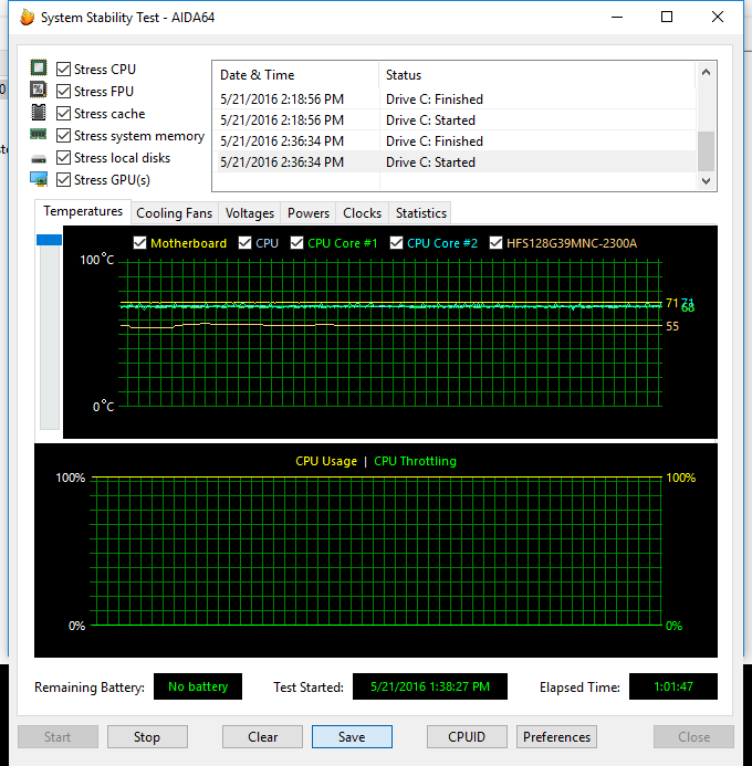 Максимальная нагрузка стресс-теста на все блоки вызывает еще больший рост температур — до 71 и 55 градусов для процессора и накопителя. Вентилятор разгоняется до 4200 об/мин, но даже на этой скорости услышать его можно только при полном отсутствии других источников звука или приложив ухо к корпусу компьютера.
