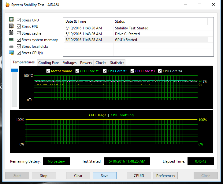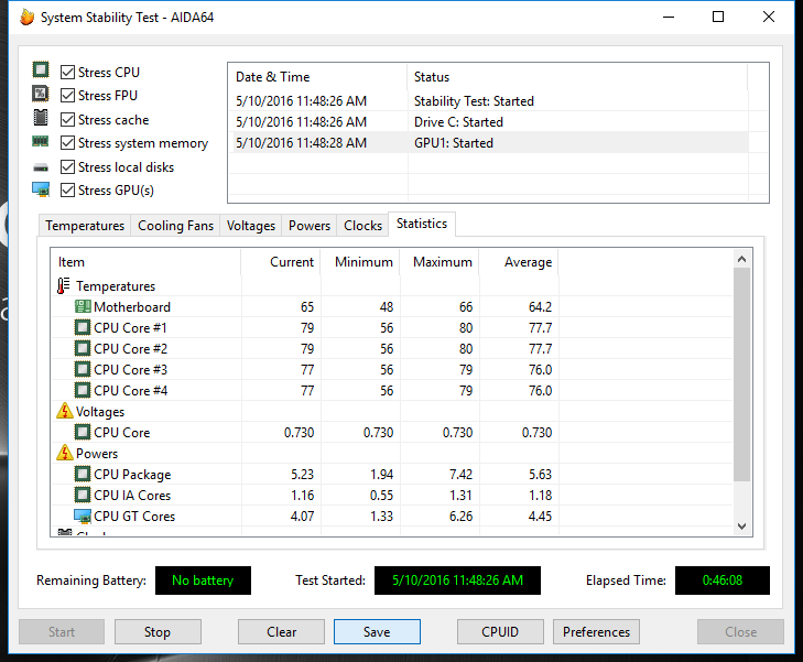 Использование всех элементов стресс-теста программы вызывает еще больший рост температуры — до 80 градусов. При этом тротлинг также отсутствует и процессор работает на тех же 1,68 ГГц, хотя уровень шума, производимого вентилятором, явно выходит за комфортные рамки.