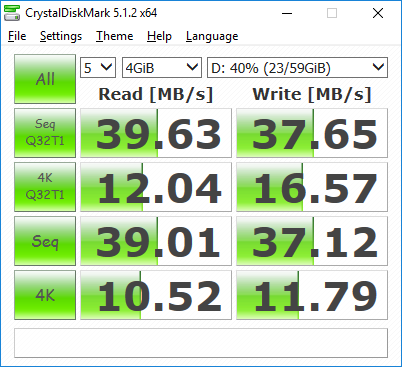 Максимальные значения для последовательных операций похожи на другие модели — чтение на 150 МБ/с и запись на 40 МБ/с. А вот со случайной записью явно что-то не так — производительность этих сценариев очень низкая по сравнению с другими накопителями в подобных устройствах.