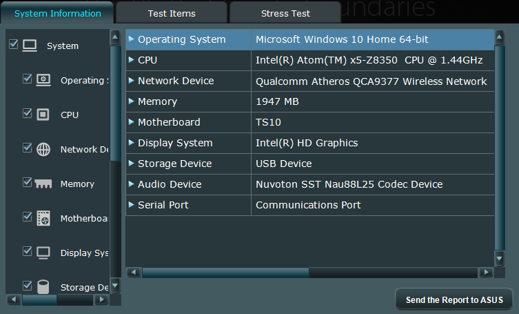 Asus VivoStick PC TS10 основан на микросхеме Intel Atom x5-Z8350, оборудован флеш-накопителем на 32 ГБ и 2 ГБ оперативной памяти. Имеет порты USB 2.0 и 3.0, а также двухдиапазонный беспроводной адаптер с поддержкой протокола 802.11ac. Работает устройство под управлением операционной системы Windows 10.