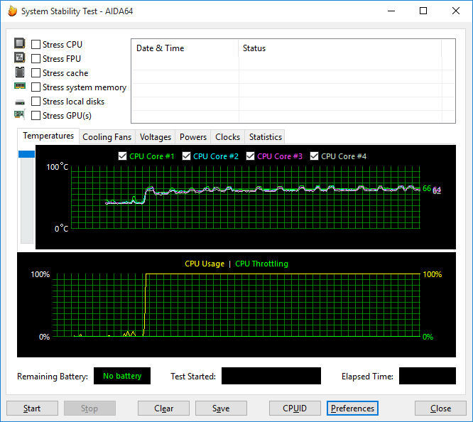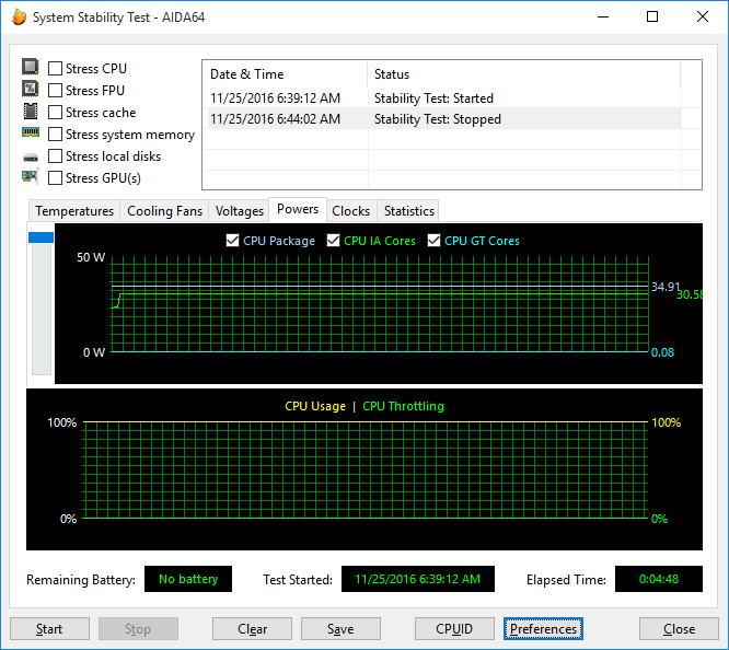 При загрузке процессора тестом Stress CPU (утилитой AIDA64 Extreme Edition — тест на стабильность системы), который использует целочисленные вычисления, частота процессора составляет 3,4 ГГц (напомним, что для процессора Intel Core i7-6700T максимальная частота в режиме Intel Turbo Boost составляет 3,6 ГГц). Температура процессора в этом режиме загрузки увеличивается до 70 °С, а мощность энергопотребления процессора колеблется в пределах 30—35 Вт.