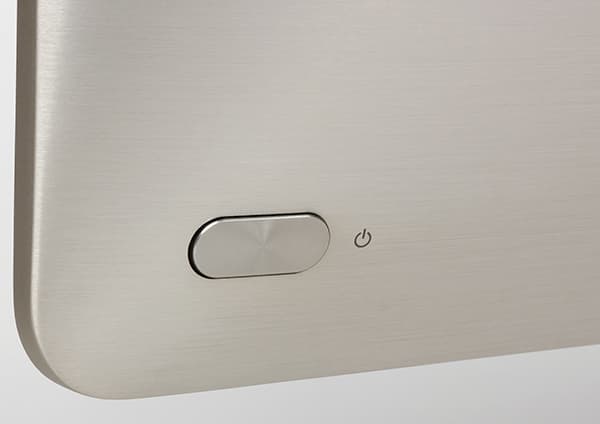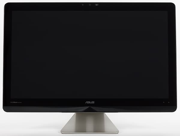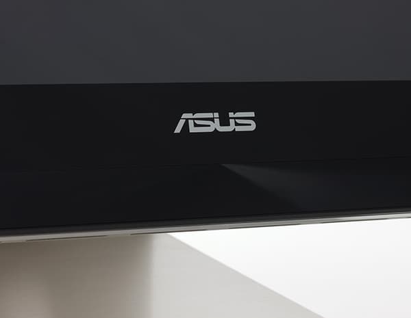 Экран в моноблоке вместе с рамкой закрыт стеклом от края до края, что создает иллюзию безрамочной конструкции. Но рамка, конечно же, имеется, и ее ширина составляет 30 мм. Ширина рамки снизу немного больше — 46 мм, но снизу она визуально разделена на две части: верхняя часть, как и боковые, закрыта стеклом, а нижняя, шириной 16 мм, имеет декоративную отделку под черный шлифованный металл с концентрически расходящимися кольцами. Снизу по центру рамки экрана (в верхней ее части) имеется серебристый логотип компании Asus, а справа расположены два светодиодных индикатора: питания и активности подсистемы хранения данных.