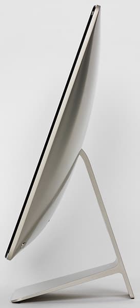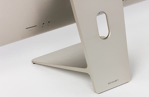 Цельнометаллическая алюминиевая подставка моноблока крепится к корпусу примерно в центре задней поверхности. Подставку можно считать идеальной. Она надежно удерживает моноблок на горизонтальной поверхности и выглядит очень стильно.