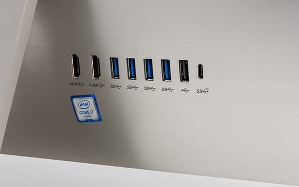 В правом нижнем углу задней поверхности корпуса расположены: порт USB 2.0, четыре порта USB 3.0, порт USB 3.1 (Type C), а также два видеовыхода HDMI. Порт USB 3.1 в данном случае реализован через контроллер ASMedia ASM1142, то есть это в чистом виде USB 3.1 (использовать данный разъем в качестве видеовыхода не получится). Впрочем, имеются два разъема HDMI, к которым можно подключить дополнительные мониторы. А вот видеовхода в моноблоке Zen AiO Pro Z240IC не предусмотрено, что можно рассматривать как недостаток.