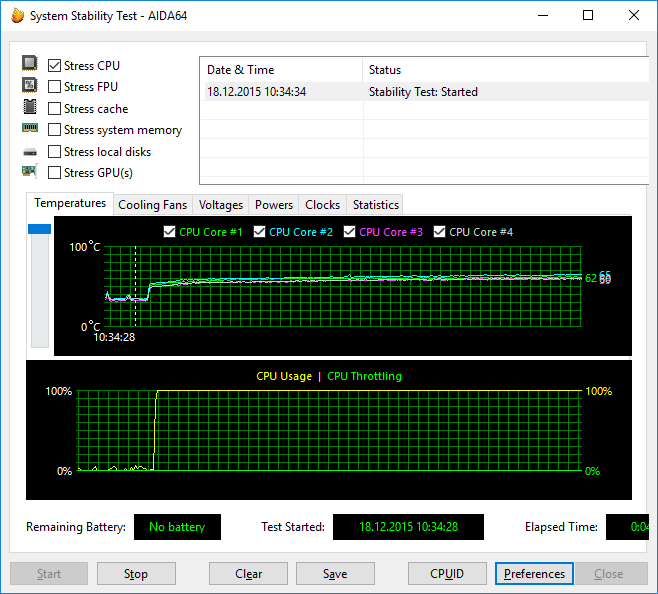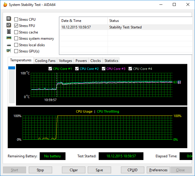 При загрузке процессора тестом Stress CPU (утилитой AIDA64 Extreme Edition — тест на стабильность системы), который использует целочисленные вычисления, частота процессора составляет 3,4 ГГц (напомним, что для процессора Intel Core i7-6700T максимальная частота в режиме Intel Turbo Boost составляет 3,6 ГГц). Температура процессора в этом режиме загрузки увеличивается до 63 °С.