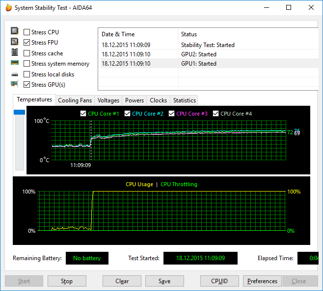 При одновременной нагрузке ядер процессора тестом Stress FPU и графических процессоров (встроенного в CPU графического ядра и дискретного GPU Nvidia) тестом Stress GPU максимальная частота процессора составляет уже 2,6 ГГц, а температура его ядер увеличивается до 76 °С.