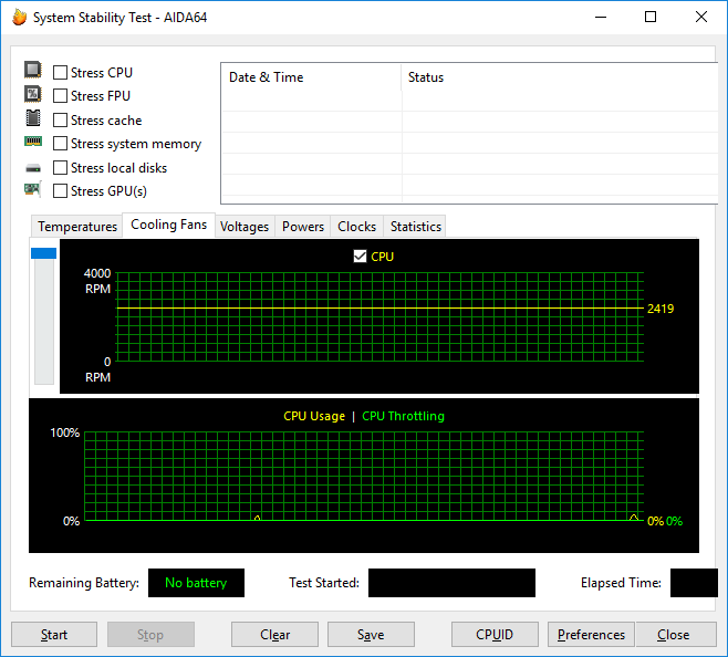 В режиме простоя вентилятор системы охлаждения вращается на скорости 2419 об/мин (тот редкий случай, когда утилита AIDA64 способна отслеживать скорость вращения вентилятора).