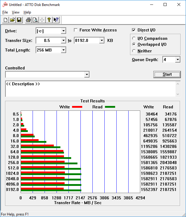 Для этого накопителя утилита ATTO Disk Benchmark определяет максимальную скорость последовательного чтения на уровне 2,18 ГБ, а скорость последовательной записи — на уровне 1,5 ГБ/с. Даже для накопителя с интерфейсом PCIe 3.0 x4 это очень высокие результаты. Пожалуй, это один из самых скоростных на сегодняшний день SSD-накопителей.