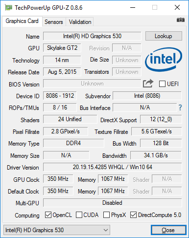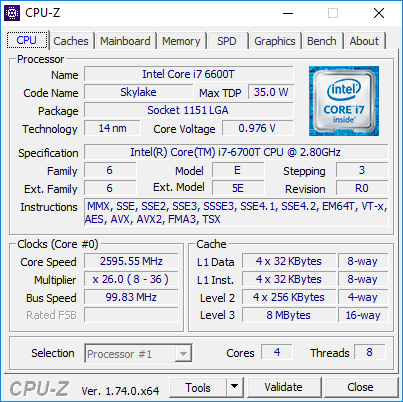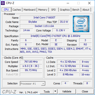 Итак, основой нашего моноблока Asus Zen AiO Pro Z240IC является системная плата на базе чипсета Intel H170 и четырехъядерного процессора Intel Core i7-6700T. Этот процессор имеет номинальную тактовую частоту 2,8 ГГц, которая в режиме Turbo Boost может повышаться до 3,6 ГГц. Размер его кэша L3 составляет 8 МБ, а расчетная максимальная мощность — 35 Вт. В процессор интегрировано графическое ядро Intel HD Graphics 530, базовая частота которого составляет 350 МГц, а частота в режиме Turbo Boost — 1,1 ГГц.