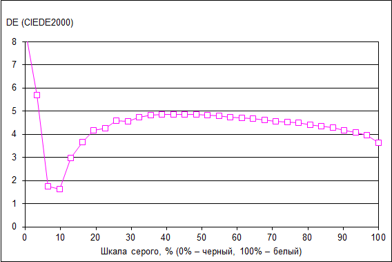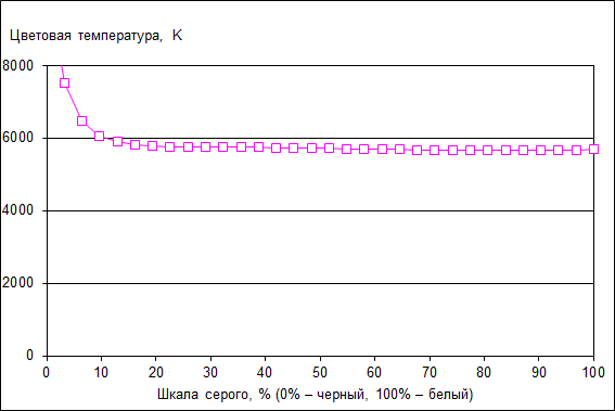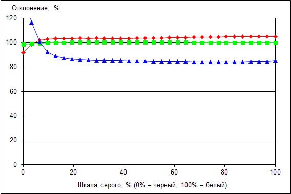 Стабильность цветовой температуры объясняется тем, что основные цвета хорошо сбалансированы по всей шкале серого, а немного заниженная температура объясняется тем, что по всей шкале серого наблюдается дефицит синего цвета.