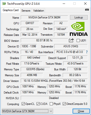 Как уже отмечалось, в моноблоке Asus Zen AiO Pro Z240IC установлена видеокарта Nvidia GeForce GTX 960M с 4 ГБ видеопамяти GDDR5.