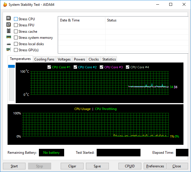 В режиме простоя частота процессора в моноблоке составляет 800 МГц (естественно, речь идет о сбалансированной схеме энергопотребления), а температура 35-ваттного процессора Core i7-6700T в этом режиме составляет примерно 34 °С.