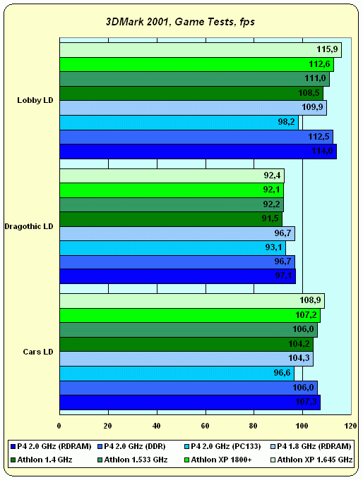 Легко заметить, что по общему баллу 3DMark 2001 производительность различных систем за одним единственным исключением различается на ничтожно малую величину. И это несмотря на то, что взят был режим low detail т.е. нагрузка на видеокарту была уменьшена насколько это возможно. Единственный отстающий — система на базе i845/PC133 четко указывает на причину — при такой частоте работы процессоров все упирается в скорость подсистемы памяти. Однако при этом разогнанный Athlon XP даже обгоняет Pentium 4 2.0 GHz + i850, и последнему не помогает даже самая на сегодняшний день быстрая двухканальная PC800 RDRAM. Вывод? Наверное, в случае Pentium 4 + RDRAM vs. Athlon XP + DDR, мы видим ситуацию, когда производительность подсистемы памяти в обоих случаях достаточна, и вот тут уже начинает играть роль скорость самого процессора.